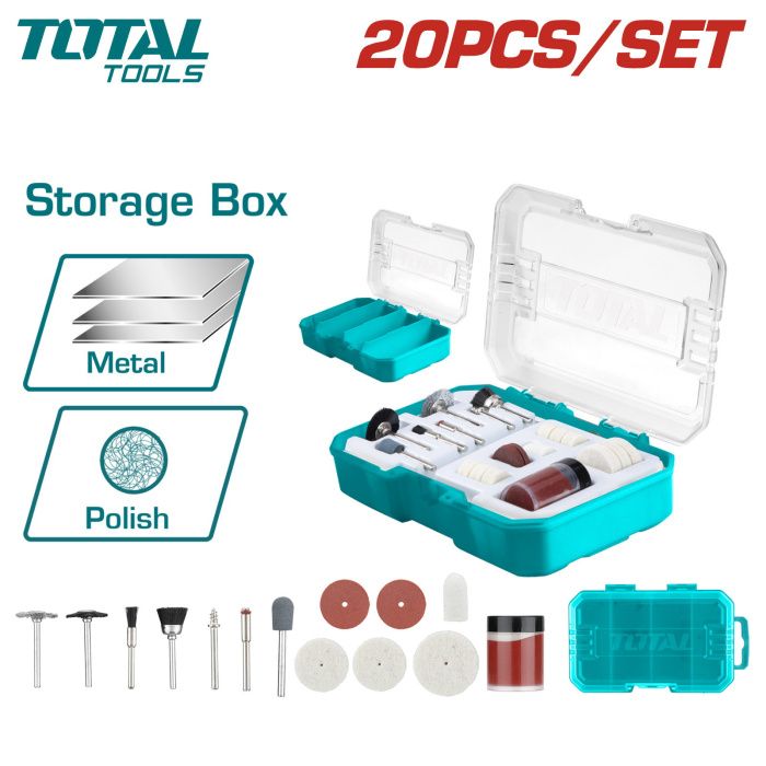 - Набор из 20 предметов для очистки, полировки, удаления ржавчины и финишной обработки различных материалов.