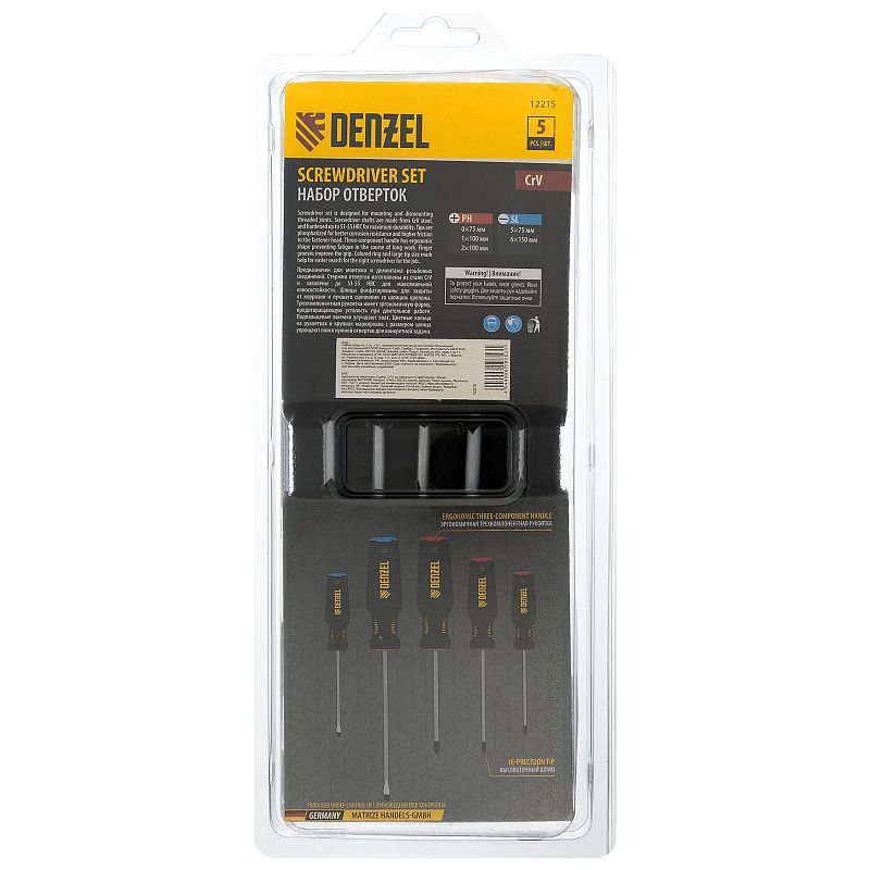 Набор отверток, 5 пр., CrV, трехкомпонентная рукоятка Denzel 12215, описание:
