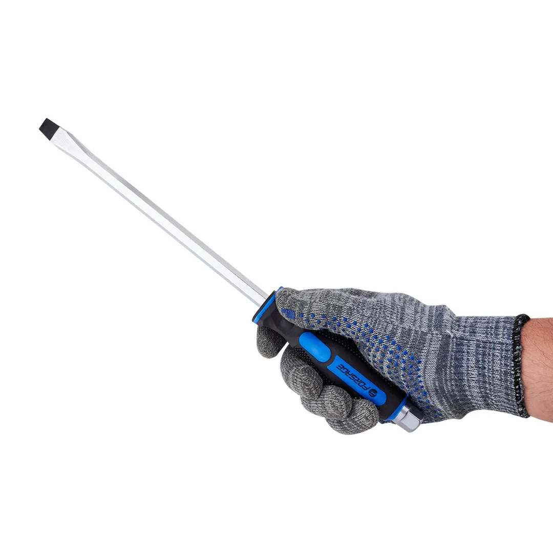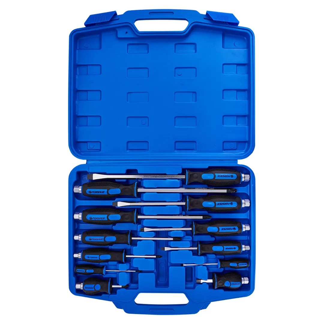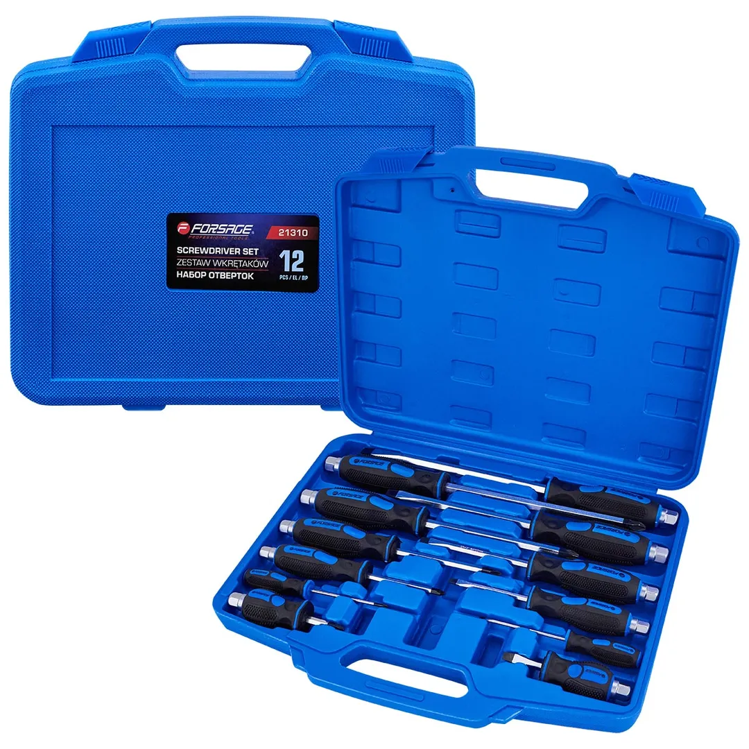 Набор отверток силовых магнитных 12 предметов в пластиковом кейсе - это профессиональный набор инструментов для работы с различными видами крепежных соединений. Он состоит из шести отверток с различными шлицами, что позволяет подобрать инструмент для работы с любыми видами соединений. Инструменты изготовлены из высококачественной стали S2 которая обеспечивает высокую прочность и надежность отверток. Магнитные наконечники отверток позволяют легко удерживать мелкие детали и крепежные элементы. Силовые отвертки снабжены ручками под ключ, что позволяет передавать дополнительный крутящий момент с помощью рожкового или накидного гаечного ключа. Двухкомпонентные рукоятки отверток обеспечивают надежный захват и удобство работы Комлпектация: Отвертки крестовые PH2x38 мм, PH0x75 мм, PH1x75 мм, PH2x100 мм, РН3x150 мм, PH4x200 мм; Отвертки шлицевые SL6х38 мм, SL3.2х75 мм, SL5х75 мм, SL6x100 мм, SL8x150 мм, SL9.5х200 мм.Преимущества работы с нами