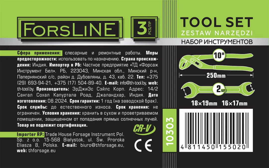 Набор пассатижи переставные 250 мм и 2 ключа 16х17, 18х19 мм ForsLine FL-10303