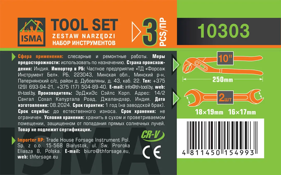 Набор пассатижи переставные 250 мм и 2 ключа 16х17, 18х19 мм ISMA ISMA-10303