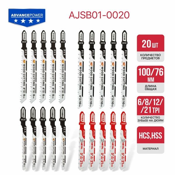 Набор пилок для лобзиков ADVANCE 20 шт, дерево/металл/фигурный рез, блистер PIT AJSB01-0020, описание: