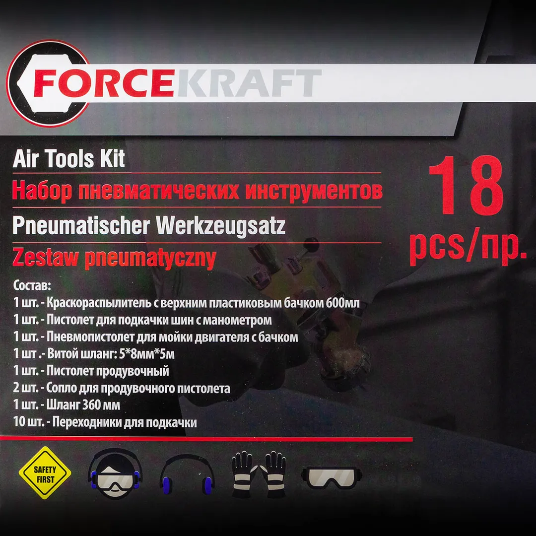 Набор пневмоинструмента 18 пр, краскопульт, обдувочник, подкачка, 10 адаптеров и 1 шланг для подкачки, промывка, шланг 5 м ForceKraft FK-8031K18-G (E-70)