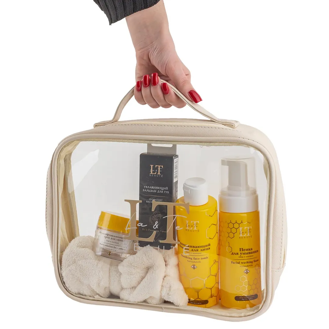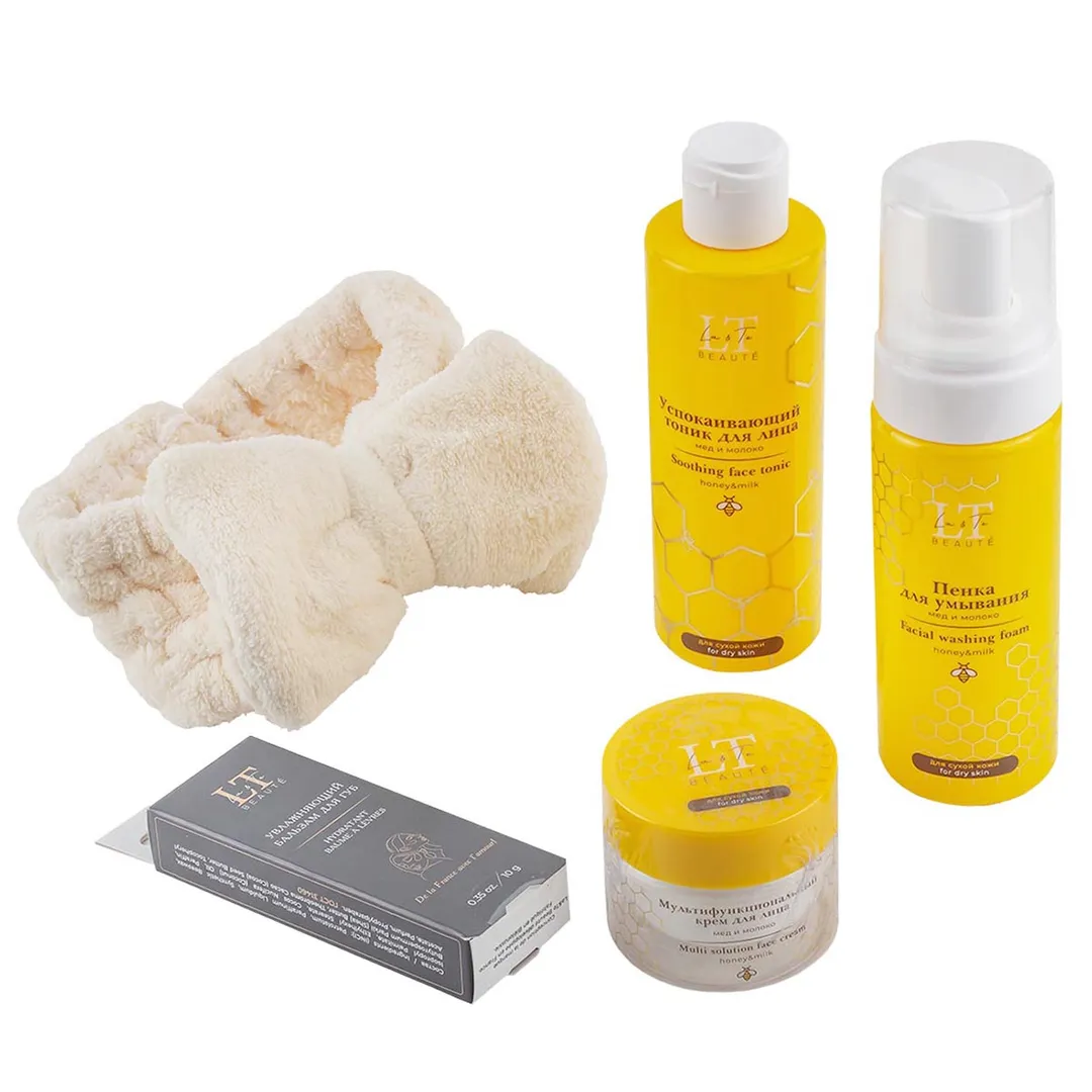 Набор по уходу за лицом для сухой кожи, тоник 1190, крем 1244, пенка 1251, бальзам 1756, повязка -бант белая, сумка-органайзер La and Te beaute LT-CB8