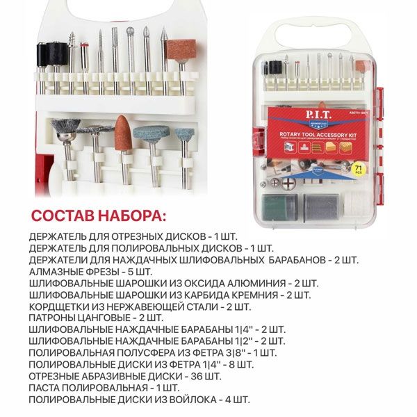 Набор принадлежностей для гравировальных машин, 71 предмет, пластиковый кейс PIT ASET11-0071, описание: