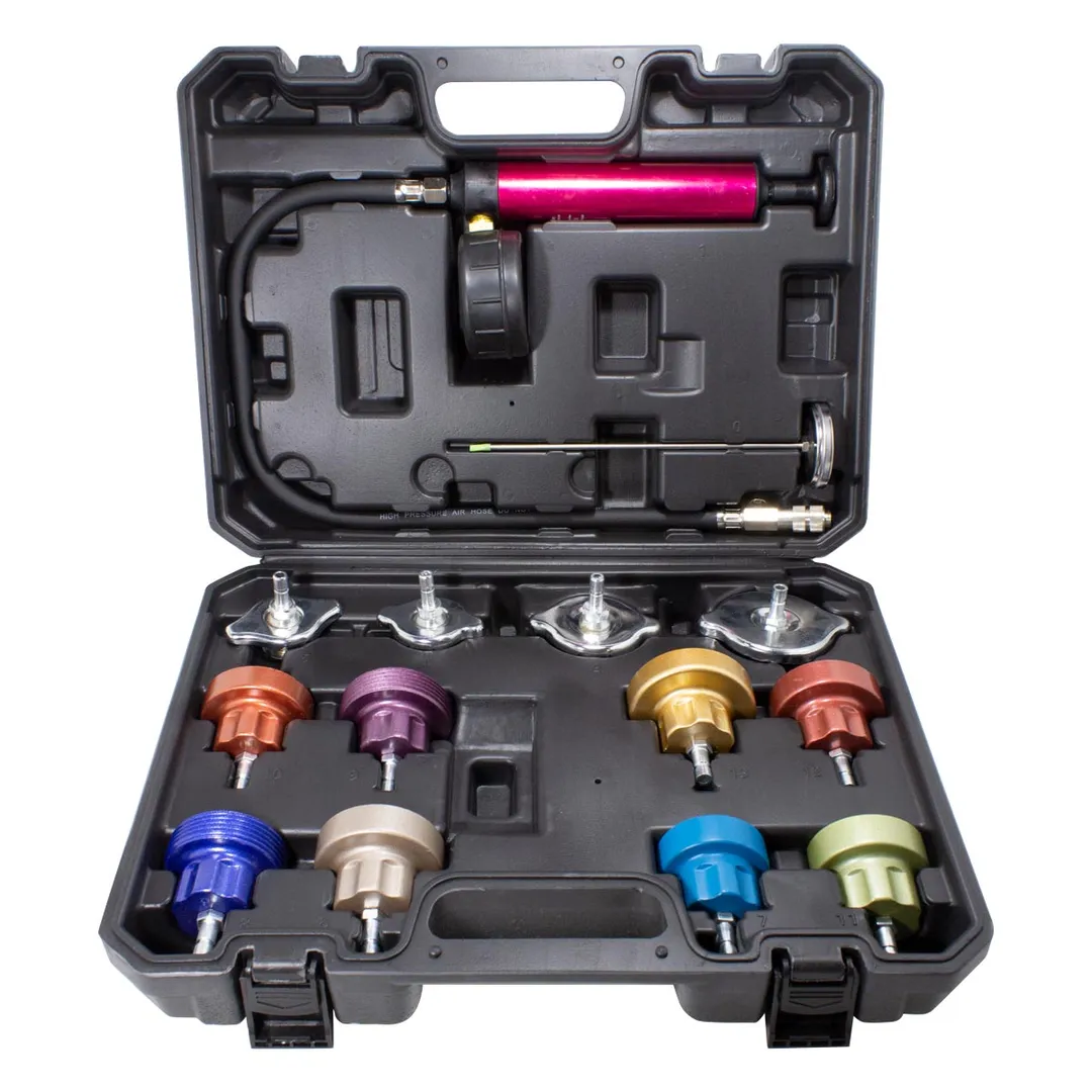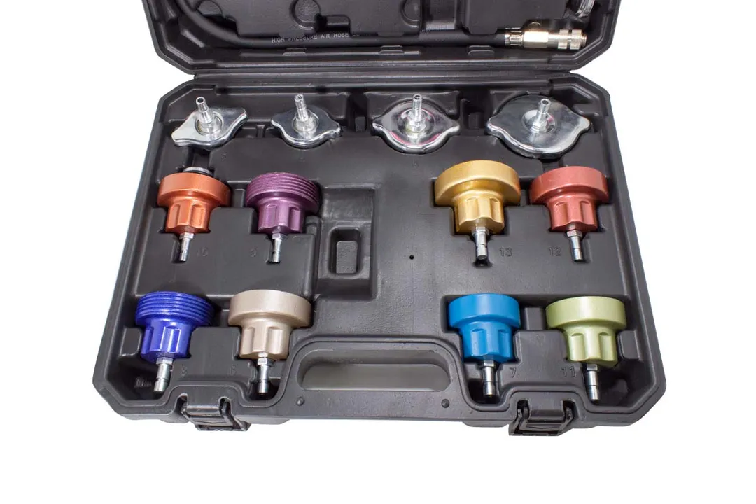 Набор инструментов для систем охлаждения из 14 предметов в кейсе предназначен для проверки давления и герметичности систем охлаждения автомобилей. Набор включает в себя различные приспособления, такие как манометр, насос для создания давления, адаптеры и шланг. С их помощью можно легко и точно измерить давление в системе охлаждения и обнаружить возможные утечки. Приспособления имеют шкалу измерения от 0 до 2,5 Бар, что позволяет проверять системы охлаждения с разными требованиями к давлению. Они также обладают высокой точностью и надежностью, что позволяет получить достоверные результаты. Кейс, в котором поставляется набор, обеспечивает удобное хранение и транспортировку приспособлений. Он имеет специальные отделения для каждого предмета, что позволяет сохранить их в порядке и предотвратить повреждения при транспортировке. Набор приспособлений для тестирования систем охлаждения является необходимым инструментом для автомастерских, сервисных центров и владельцев автомобилей. Он позволяет быстро и эффективно обнаружить и устранить проблемы с системой охлаждения, что помогает предотвратить серьезные поломки и повышает безопасность на дороге.Преимущества работы с нами