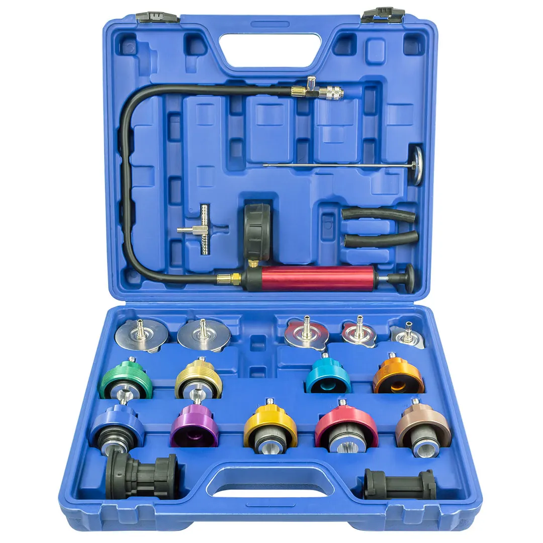 Набор приспособлений для тестирования систем охлаждения 21 предмет (0-2.5bar), в кейсе. Комплект 3 в 1: тестер давления охлаждающей жидкости, измерение температуры. Ручной тестер давления системы охлаждения может диагностировать, протекает ли радиатор, а термометр проверяет температуру охлаждающей жидкости. Подходит для использования в гараже и для работы на СТО. Защитите систему охлаждения автомобиля, обнаружив утечку заранее, чтобы предотвратить повреждения двигателя, проверьте систему охлаждения эффективным и быстрым способом с наименьшими затратами. Набор приспособлений для тестирования систем охлаждения универсален, можно использовать для диагностики автомобилей различных марок, грузовиков и погрузчиков. Для удобства хранения и транспортировки поставляется в прочном пластиковом кейсе. Комплектация: -колпачки испытательного адаптера радиатора с цветной кодировкой 9 шт., -адаптеры крышек радиатора и разъемы для обнаружения утечки крышки радиатора, -ручной насос с датчиком (3" цветной циферблат, 0-35PSI / 0-2,5 бар), -термометр изготовленный из нержавеющей стали (диапазон шкалы: 0 - 200 °C / 32 - 400 ° F), -кейс.Преимущества работы с нами