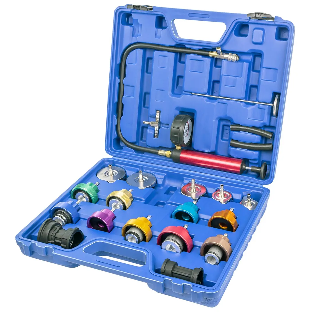 Набор приспособлений для тестирования систем охлаждения 21 предмет (0-2.5bar), в кейсе. Комплект 3 в 1: тестер давления охлаждающей жидкости, измерение температуры. Ручной тестер давления системы охлаждения может диагностировать, протекает ли радиатор, а термометр проверяет температуру охлаждающей жидкости. Подходит для использования в гараже и для работы на СТО. Защитите систему охлаждения автомобиля, обнаружив утечку заранее, чтобы предотвратить повреждения двигателя, проверьте систему охлаждения эффективным и быстрым способом с наименьшими затратами. Набор приспособлений для тестирования систем охлаждения универсален, можно использовать для диагностики автомобилей различных марок, грузовиков и погрузчиков. Для удобства хранения и транспортировки поставляется в прочном пластиковом кейсе. Комплектация: -колпачки испытательного адаптера радиатора с цветной кодировкой 9 шт., -адаптеры крышек радиатора и разъемы для обнаружения утечки крышки радиатора, -ручной насос с датчиком (3" цветной циферблат, 0-35PSI / 0-2,5 бар), -термометр изготовленный из нержавеющей стали (диапазон шкалы: 0 - 200 °C / 32 - 400 ° F), -кейс.Преимущества работы с нами