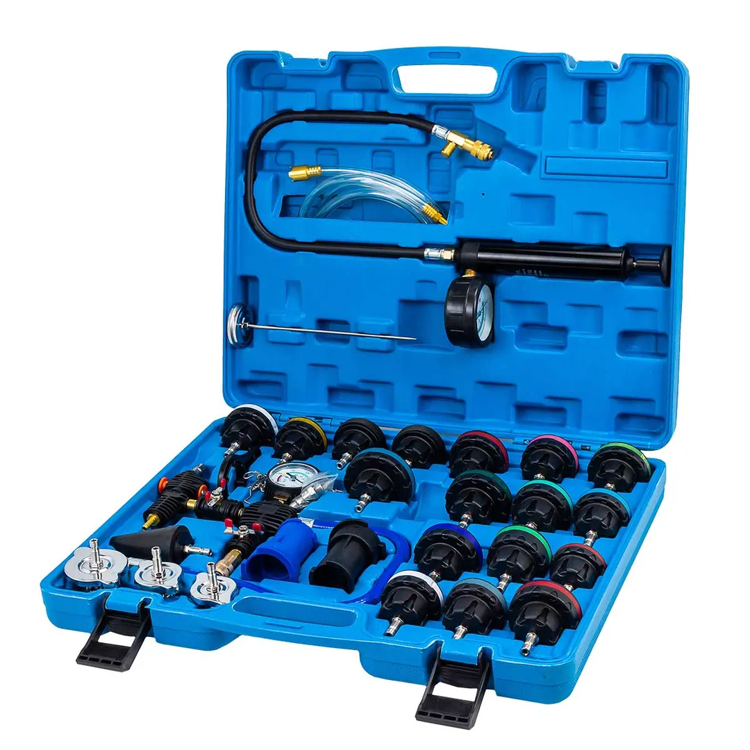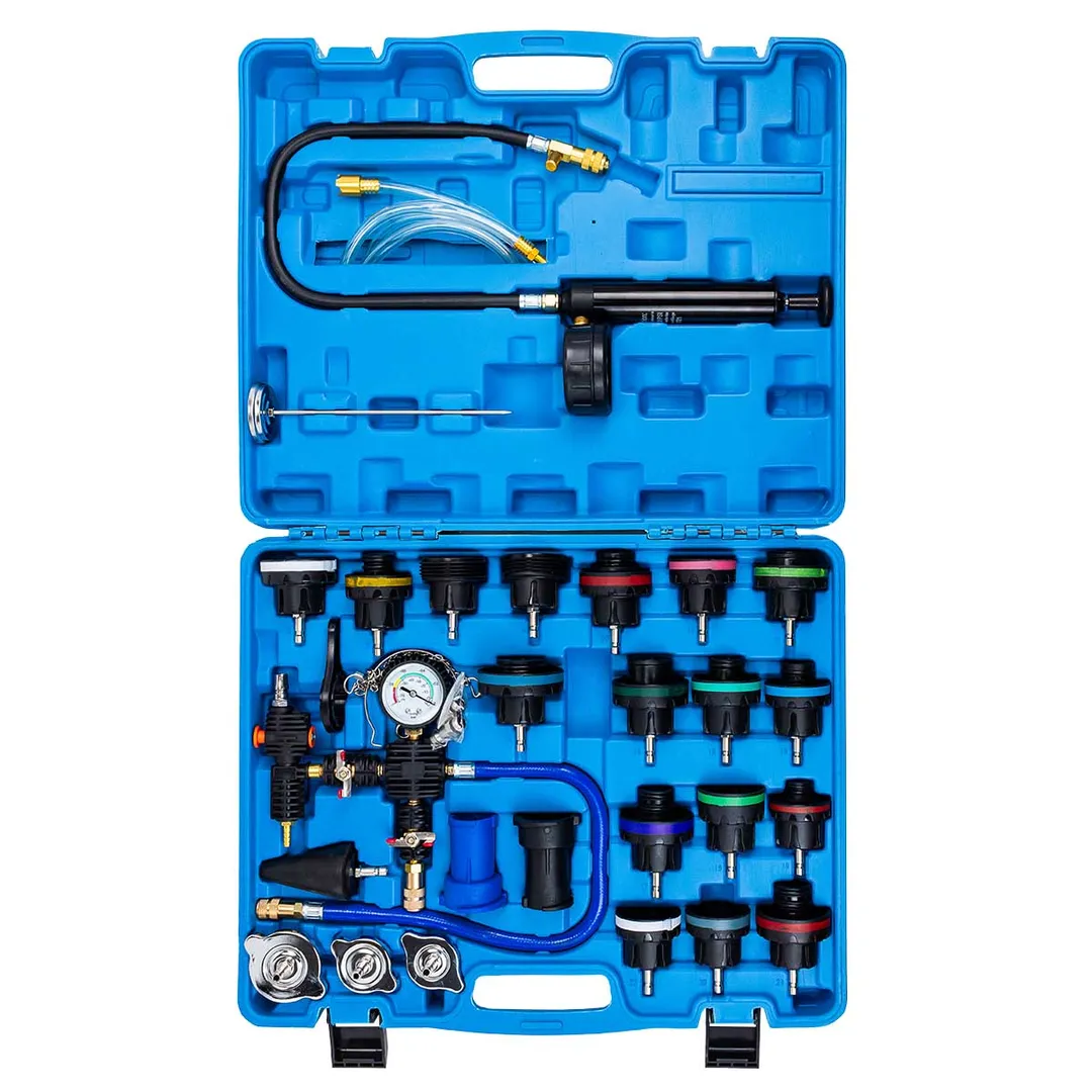 Набор приспособлений для тестирования систем охлаждения 28 предметов (0-2.5bar), в кейсе предназначен для диагностики и определения утечек в системе охлаждения двигателя внутреннего сгорания. В набор входят насос с быстросъёмным разъёмом и адаптеры для заливных горловин радиаторов и расширительных бачков. Комплект подходит для работы с большинством современных автомобилей. Набор подходит для для: GM (Cadillac); Mercedes Benz, GM (Buick), Jeep; Peugeot, Subaru, Chrysler, Acura, GM (Nova, Spectrum, Sprint), Mitsubishi, Nissan, Mazda, Toyota, Infiniti, GEO, Suzuki, Isuzu; Honda, Toyota, Suzuki, Mitsubishi, Chrysler, Acura; Mercedes Benz (ML-class), GM (Achiva, Skylark, Gramd Am 1992…2002гг); Volvo, Saab, Sterling, Citroen, Renault, Fiat, Alfa, Jeep; VW (Vento, T4, Passat-1996, Golf, Beetle, Sharan); Audi (A4, A5, A6), BMW 345, VW (Passat-1997…2002гг); BMW; Audi, VW;Ford, International, Land Rover, Opel, Jaguar; Mercedes Benz (C-class, E-class, S-class). Насос оснащен манометром, нагнетательным шлангом с быстроразъемным соединением и ниппельным клапаном, способен поднимать давление в проверяемом контуре до 2,5 Бар. Работа с тестовым комплектом начинается с установки радиаторной крышки с соединителем для насоса, а также соответствующего адаптера расширительного бачка. Постепенно поднимая насосом давление в системе, можно установить факт утечки и быстро найти негерметичное соединение. Набор приспособлений для тестирования систем охлаждения в кейсе прост и эффективен в использовании, и в то же время предельно универсален, так как его можно использовать для диагностики и ремонта автомобилей различных марок и моделей. Комплектация: -игольчатый термометр, -насос с манометром, -колпачки испытательного адаптера с цветной кодировкой 17 шт., -резиновые шланги ( 21" " и 18" " ), -адаптеры 3 шт., -прозрачный шланг для заполнения охлаждающей жидкости и дренажа, -манометр, -2 разъёма для обнаружения утечки крышки радиатора, -кейс.Преимущества работы с нами