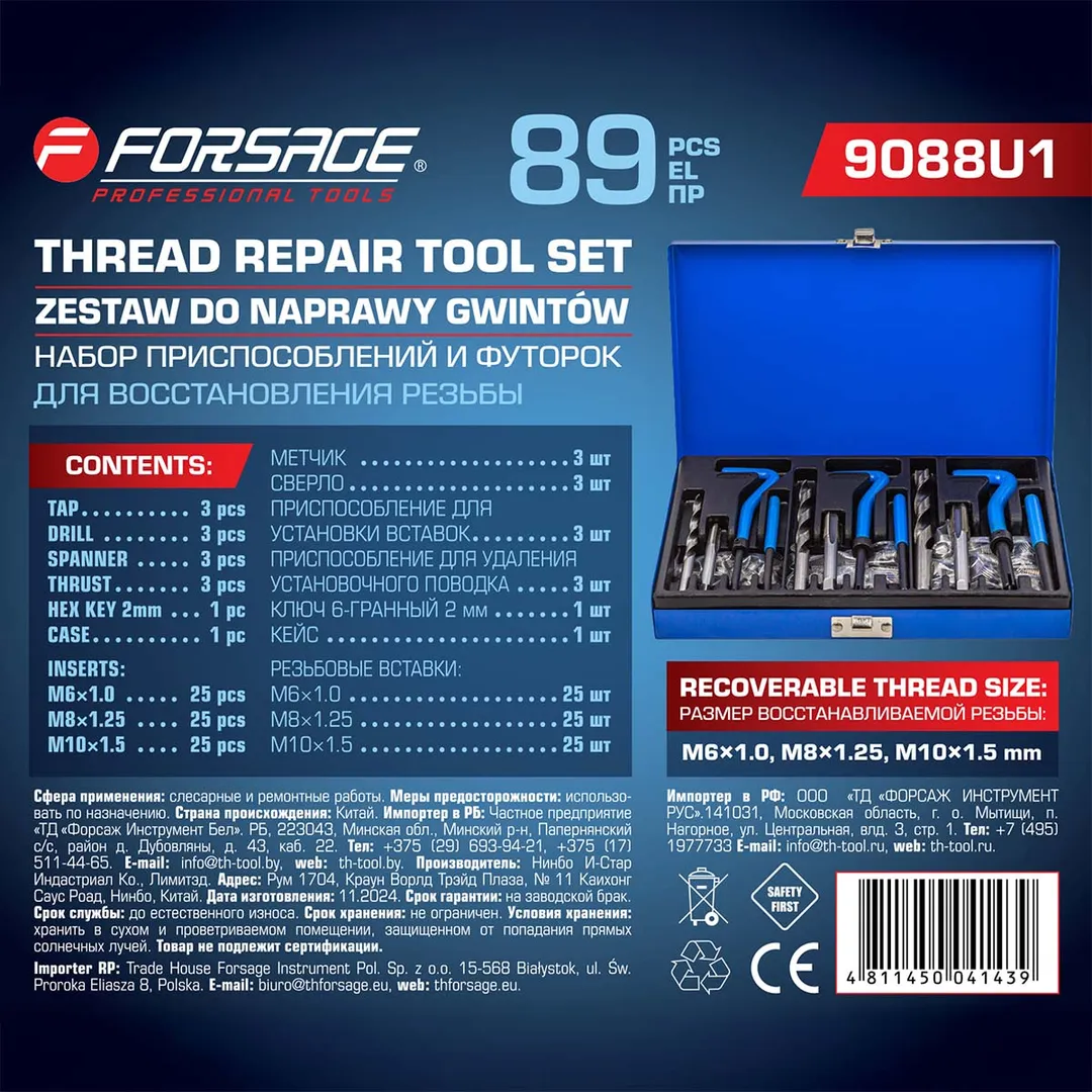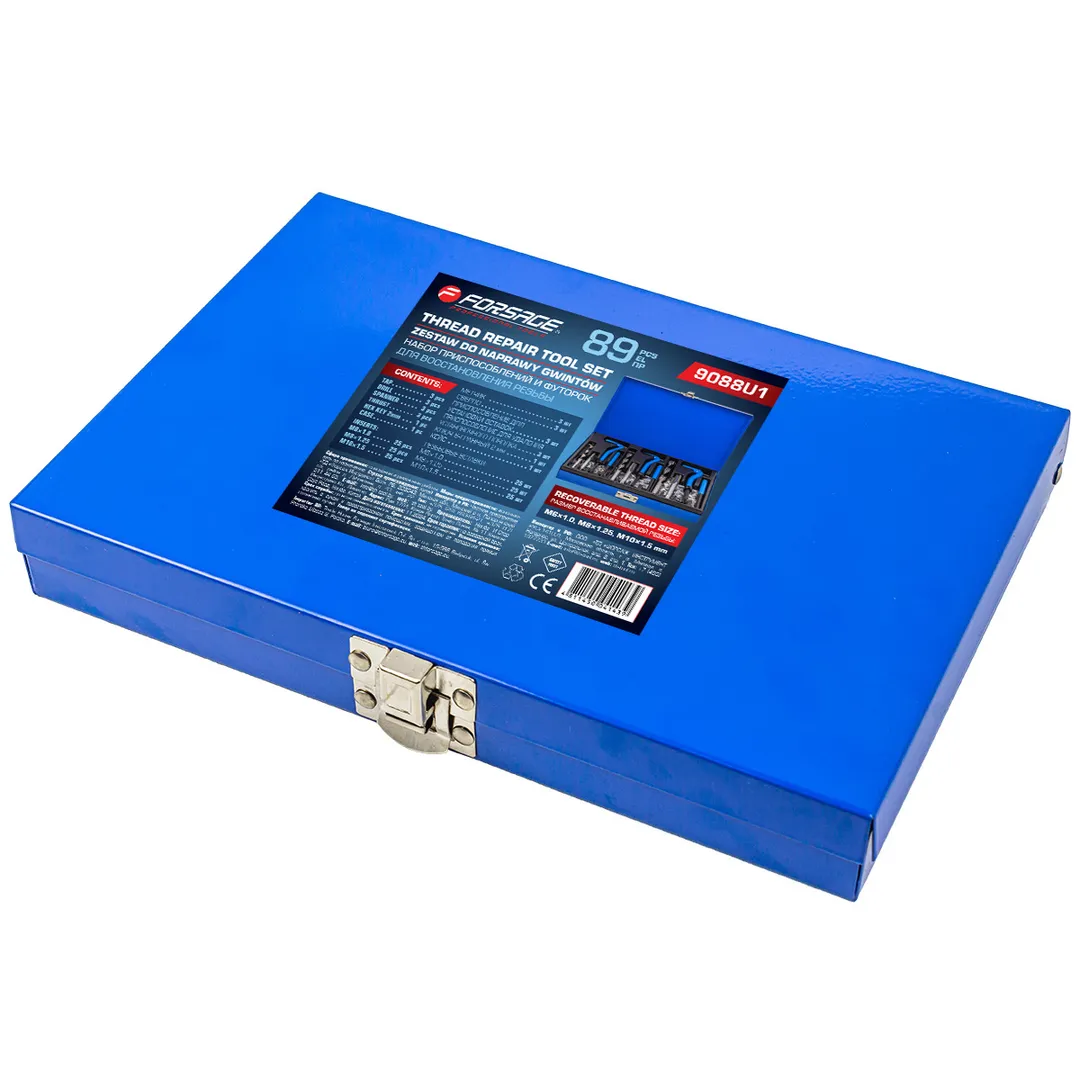 Набор приспособлений и футорок для восстановления резьбы, М6х1, М8х1.25, М10х1.25 88 пр. Forsage F-9088U1, описание и характеристики: