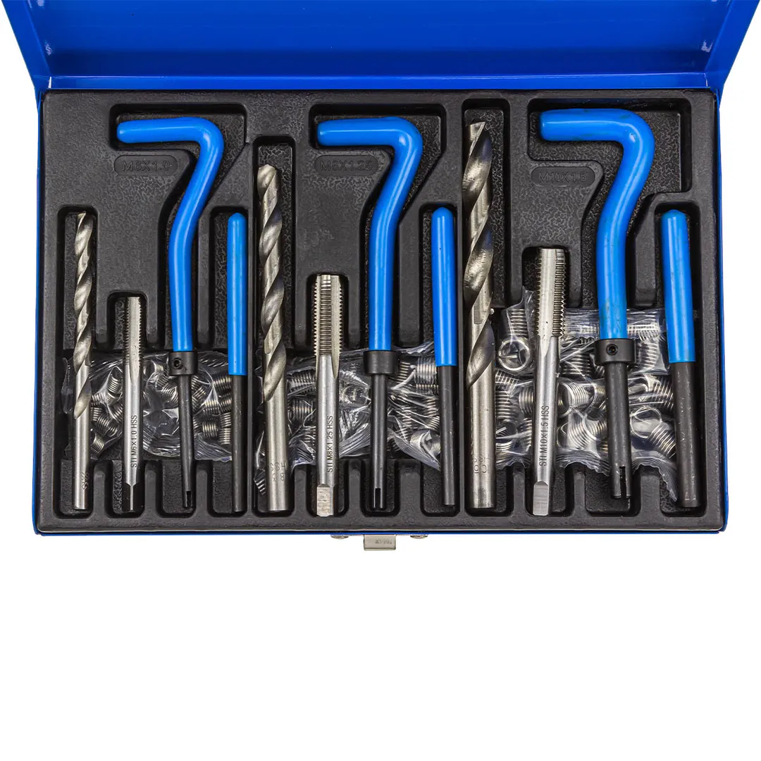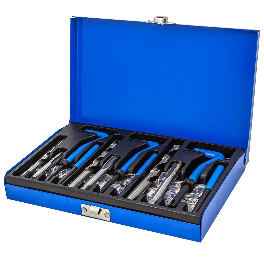 Набор приспособлений и футорок для восстановления резьбы(М6х1, М8х1.25, М10х1.5) 88предметов в металлическом кейсе Такого рода наборы предназначены для восстановления внутренней резьбы, которое осуществляется путём вкручивания пружинной резьбовой вставки. Футорки имеют вид тонкого фиксатора в форме упругой спирали. Во внутренней стороне витки образуют профиль ромбического типа. Изделия оснащены специальными поводковыми язычками, предназначенными для ввинчивания в старую резьбу. После установки старый элемент можно будет легко отсоединить. Их можно использовать практически для любой резьбы. Используются когда при замене свечей в автомобиле срывается старая резьба, также для монтажа сантехнического оборудования. Изготавливаются резьбовые вставки, как правило, из нержавеющей стали. Изделия, изготовленные из такой металлической основы, обладают высоким уровнем прочности, износостойкости и долговечности.Преимущества работы с нами