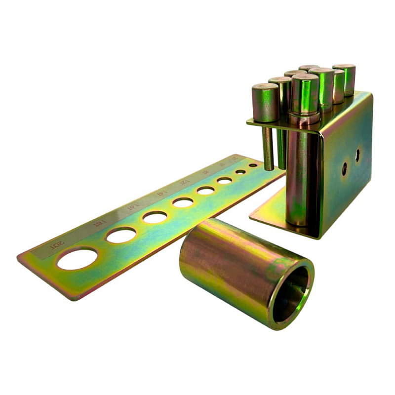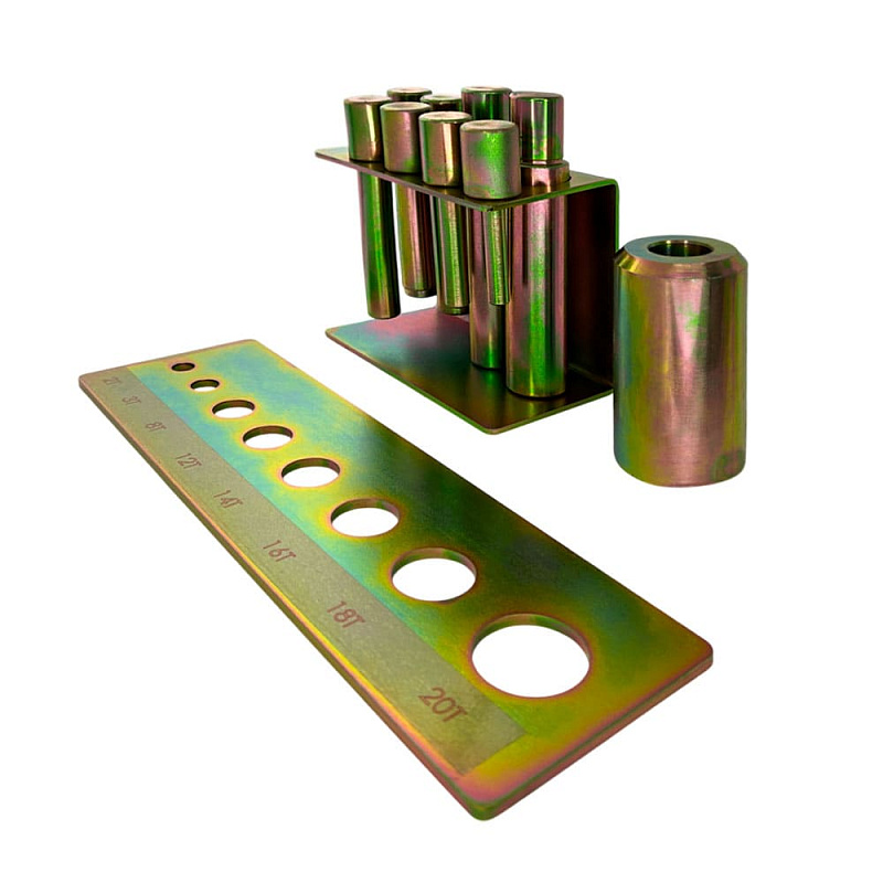 В комплект входят 8 пуансонов с диаметрами 10, 12, 16, 18, 20, 22, 25 и 30 мм, обеспечивающие широкий диапазон применения для различных задач по обработке металла.