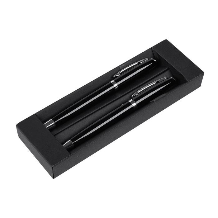 Письменный набор ручек Alphabet в картонной коробке. Набор состоит из шариковой ручки с поворотным механизмом выдвижения стержня и ручки роллера с колпачком. Обе ручки укомплектованы стержнями с черной пастой.