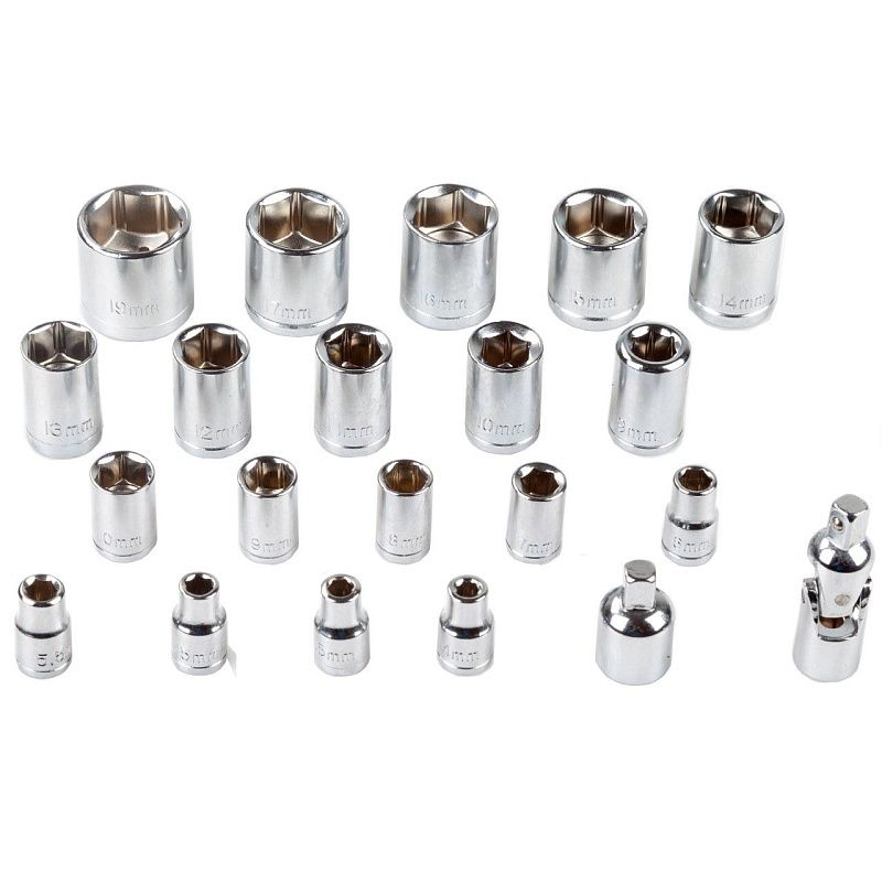 - Набор головок торцевых разного диаметра с посадочным квадратом ¼ и ⅜ дюймов позволяют осуществлять работы с крепежами различных размеров и видов.