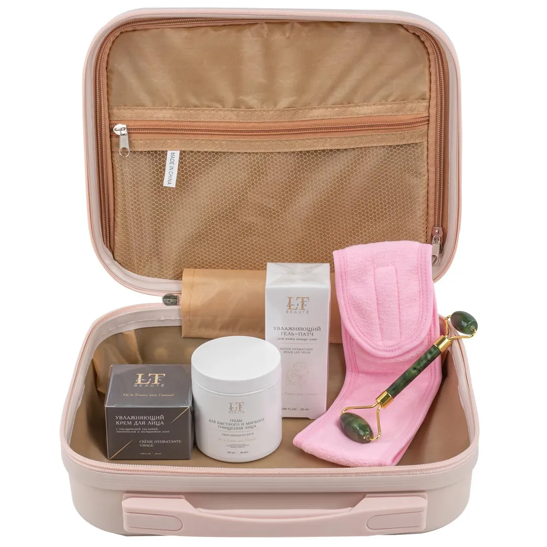 Набор, сумка розовая2208#, крем для лица, ролик зеленый, Пэды, гель патчи, повязка на липучке розовая La and Te beaute LT13Bag