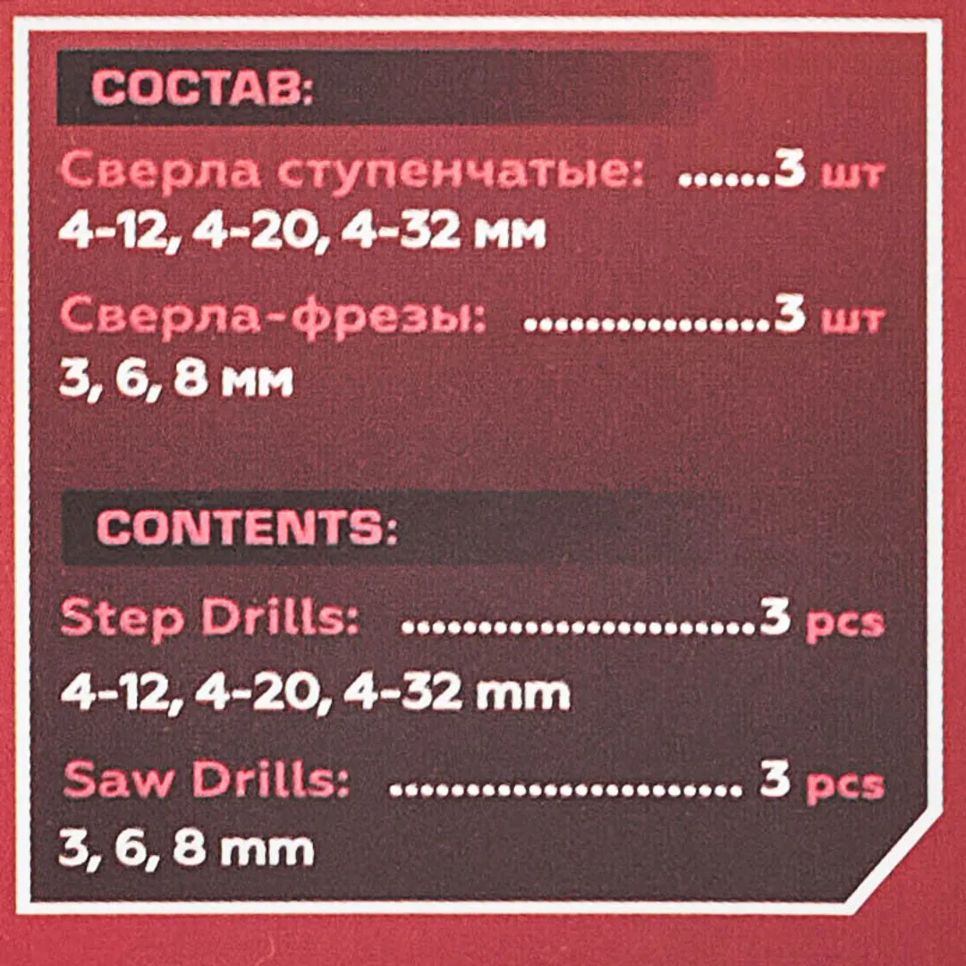 Набор сверл ступенчатых 4-12, 4-20, 4-32 мм, сверл-фрез 3, 6, 8 мм, по алюминию, меди, дереву, пластику 6 пр JBC JBC-44706