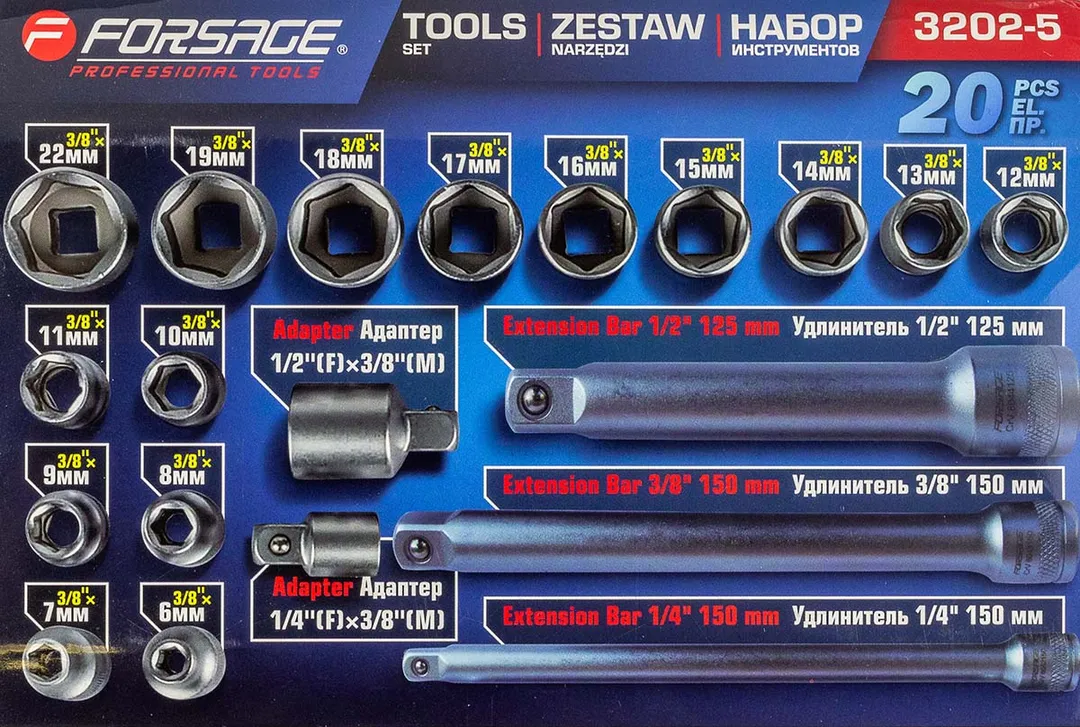 Набор торцевых головок 3/8' 20 пр. 6-гр. 6-22 мм в пласт.кейсе Forsage F-3202-5, описание и характеристики: