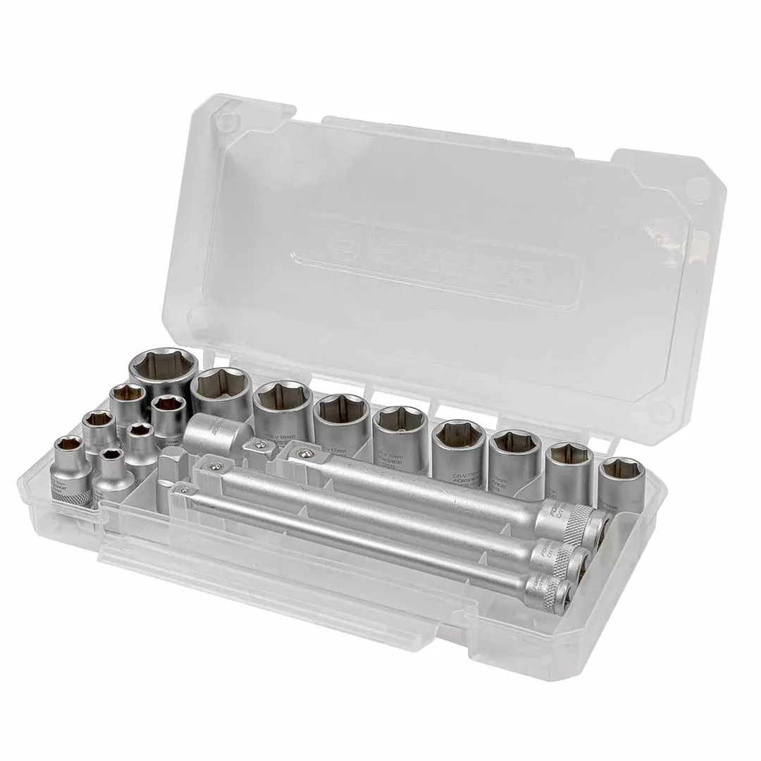 Набор инструментов 3/8"на 20 пр. (6гр.) включает в себя широкий ассортимент головок и инструментов, предназначенных для работы с крепежными элементами различных размеров. Набор изготовлен из высококачественной хромванадиевой стали, что обеспечивает долговечность и надежность инструмента. Головки имеют шестигранный профиль, что обеспечивает лучшее сцепление с крепежом и уменьшает вероятность его повреждения в процессе работы. Комплектация: 15шт. Головки короткие 6-р.: 6, 7, 8, 9, 10, 11, 12, 13, 14, 15, 16, 17, 18, 19, 22мм; 1шт. Удлинитель 1/4"150мм; 1шт. Удлинитель 3/8"150мм; 1шт. Удлинитель 1/2"125мм; 1шт. Адаптер 1/2"(F)х3/8"(M); 1шт. Адаптер 1/4"(F)х3/8"(M). Набор поставляется в прозрачном пластиковом кейсе.Преимущества работы с нами
