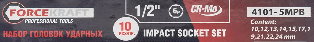 Набор ударных головок 10 пр. 1/2'' 6-гр 10-24 мм ForceKraft FK-4101-5MPB, описание и характеристики: