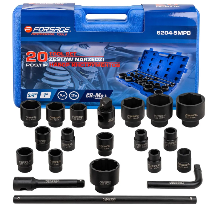 Набор ударных головок 17-50 мм 3/4''&1'' 6-гр&12-гр 20 пр Forsage F-6204-5MPB