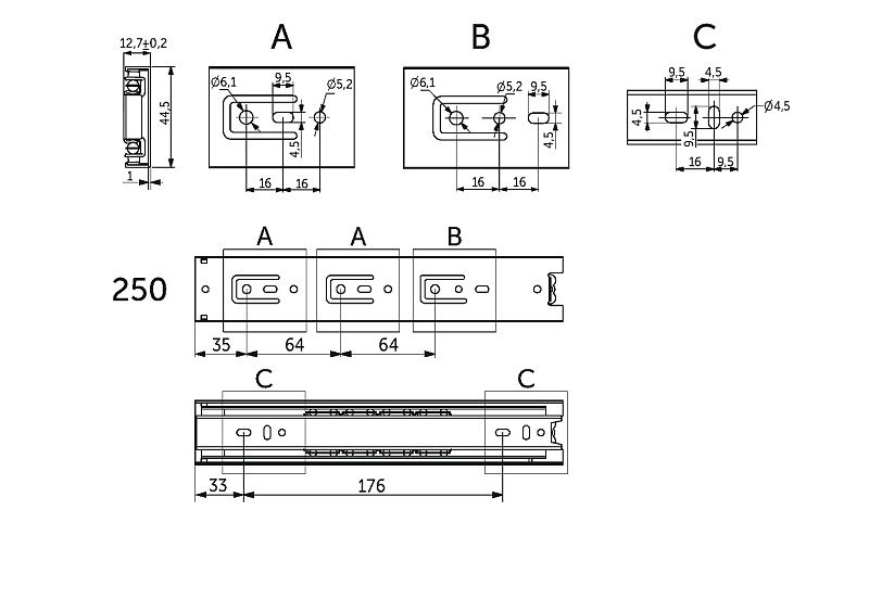 Классическая направляющая с шарикоподшипниковым механизмом и телескопической структурой, обеспечивает полное выдвижение. Высота 45 мм . Изготовлена из холоднокатаной стали. Длина -250 мм. Резиновый фиксатор от самопроизвольного открытия. Нагрузка -35 кг.Технические характеристики: