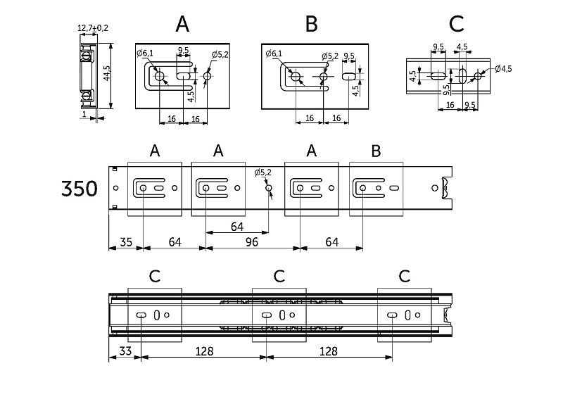 Направляющая шариковая L-350 h=45 A черный PRIME by AKS 122746, описание: