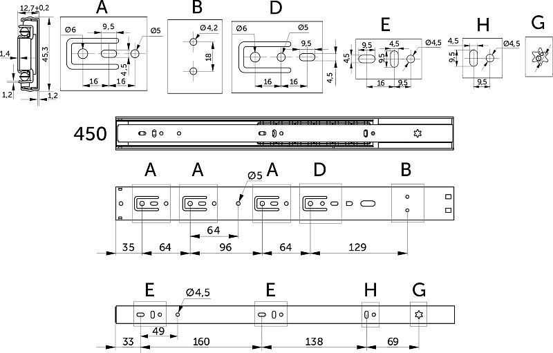 Направляющая шариковая L-450 h=45 SOFT CLOSE A PRIME by AKS 114796, описание: