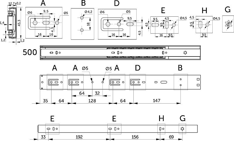 Направляющая шариковая L-500 h=45 SOFT CLOSE A черный PRIME by AKS 119777, описание: