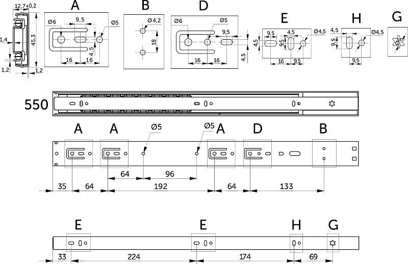 Направляющая шариковая L-550 h=45 SOFT CLOSE A PRIME by AKS 114798, описание: