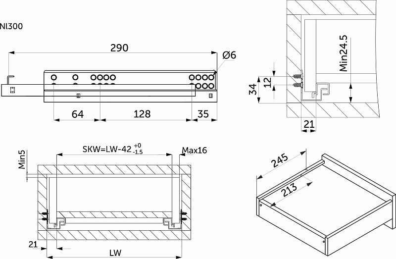 Направляющая скрытого монтажа L-300 с доводчиком ДСП до16mm насадной монтаж 3/4 с фиксаторами AKS 118275, описание: