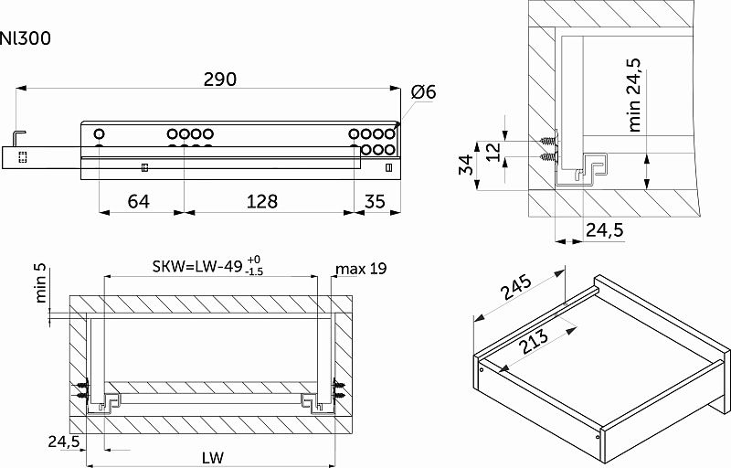 Направляющая скрытого монтажа L-300 с доводчиком ДСП до19mm насадной монтаж 3/4 с фиксаторами AKS 118583, описание: