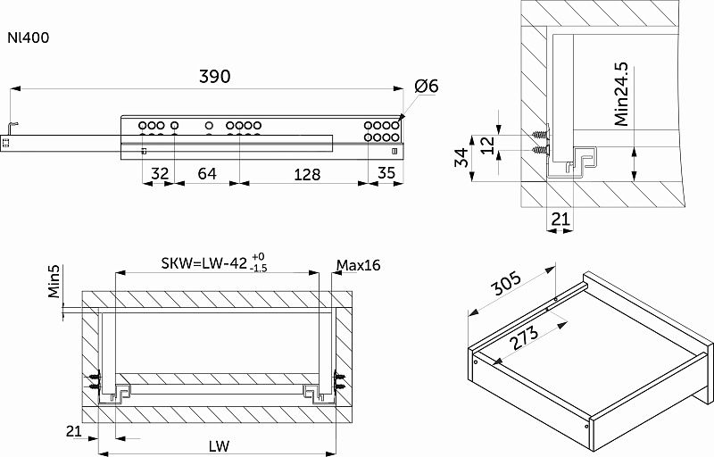 Направляющая скрытого монтажа L-400 с доводчиком ДСП до16mm насадной монтаж 3/4 с фиксаторами AKS 113089, описание: