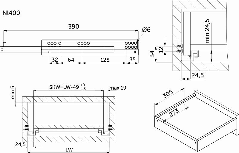 Направляющая скрытого монтажа L-400 с доводчиком ДСП до19mm насадной монтаж 3/4 с фиксаторами AKS 118581, описание: