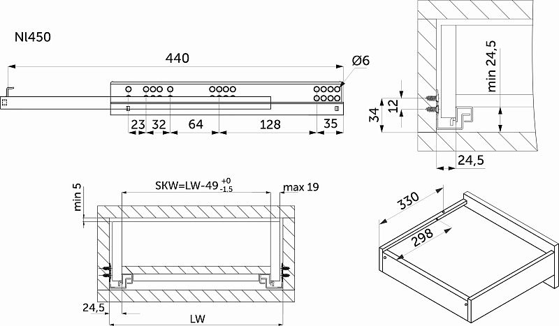 Направляющая скрытого монтажа L-450 с доводчиком ДСП до19mm насадной монтаж 3/4 с фиксаторами AKS 118579, описание: