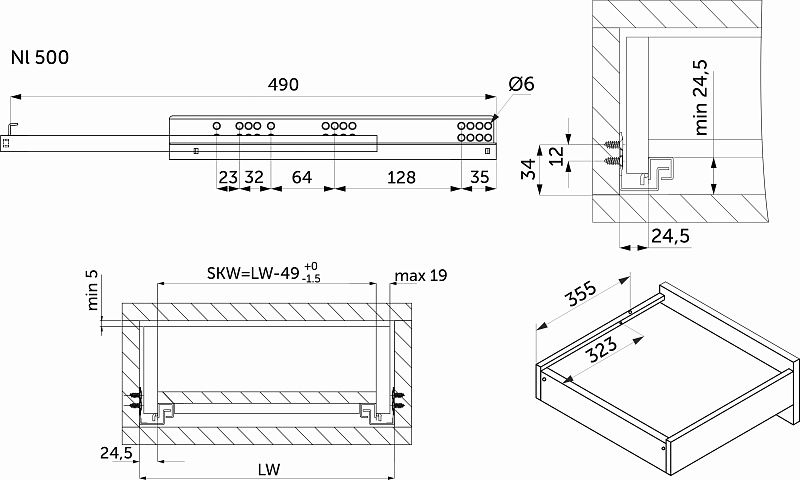 Направляющая скрытого монтажа L-500 с доводчиком ДСП до19mm насадной монтаж 3/4 с фиксаторами AKS 118578, описание:
