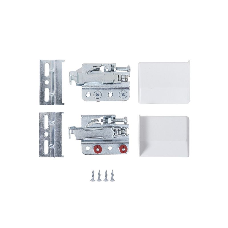 Материал: сталь + пластик/ Нагрузка на пару - 210 кг. Возможность регулировки: высота +/-11 мм, глубина max 9 мм (при регулировке навеса нельзя использовать шуруповерт). Надёжно крепится на специальную монтажную планку L=58мм. Крепится к корпусу ящика на втулках под запрессовку плюс дополнительно фиксируется саморезами, что создает более надежное соединение. После монтажа корпус навеса и отверстие в задней стенке закрываются белыми заглушками. В комплект входят: 2 навеса, 2 монтажные планки, 2 заглушки белого цвета и комплект саморезов для крепления к корпусу ящика.Технические характеристики: