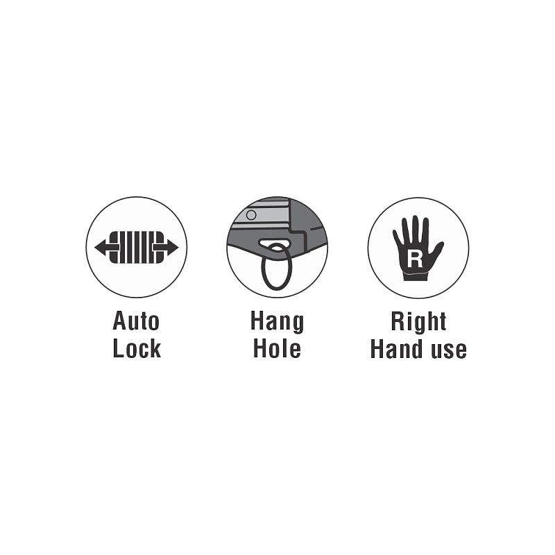 Пластиковый корпус с металлическим каналом. Механизм автоматической блокировки. Эргономичная ручка со встроенным фиксатором лезвия и приспособлением для подвешивания. 13-сегментное защелкивающееся лезвие.