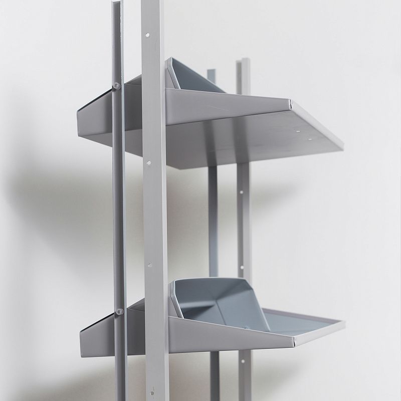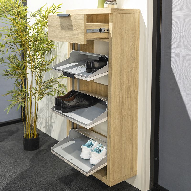 Систему для хранения обуви можно встроить в любую конструкцию. Быстрая и удобная сборка. Синхронное открывание всех секций по принципу веера облегчает выбор обуви. Компактные размеры. Система лотков: Листовой металлопрокат с полимерным покрытием. Направляющие: Анодированный алюминиевый профиль, окрашенный в серый цвет. В комплекте: система - 1шт. Крепежей в комплекте нет!Технические характеристики: