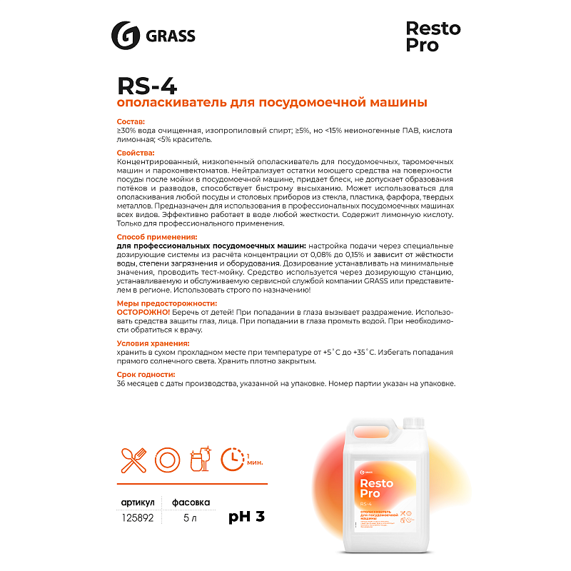 Концентрированный, низкопенный ополаскиватель для посудомоечных, таромоечных машин и пароконвектоматов. Нейтрализует остатки моющего средства на поверхности посуды после мойки в посудомоечной машине, придает блеск, не допускает образования потёков и разводов, способствует быстрому высыханию. Может использоваться для ополаскивания любой посуды и столовых приборов из стекла, пластика, фарфора, твердых металлов. Предназначен для использования в профессиональных посудомоечных машинах всех видов. Эффективно работает в воде любой жесткости. Содержит лимонную кислоту. Только для профессионального применения.