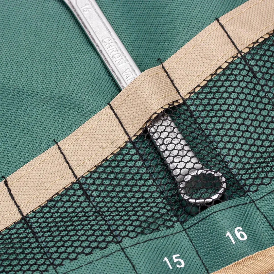 Органайзер для гаечных ключей – это хорошо продуманный аксессуар для хранения инструментов, который изготавливается для комфортного и долговечного пользования. Полотно (держатель) на 14 ключей гаечных. Чехол в развернутом виде имеет размеры 630 мм на 470 мм. Полотно-чехол для комбинированных, рожковых или накидных ключей имеет специальные отверстия с металлической оправой - они позволяют сэкономить место в гараже или мастерской, повесив набор гаечных ключей на стену или специальный стенд. Чехол-полотно для набора ключей гаечных имеет специальную фиксирующую ленту на застежке: набор комбинированных ключей можно скрутить и зафиксировать лентой.Преимущества работы с нами