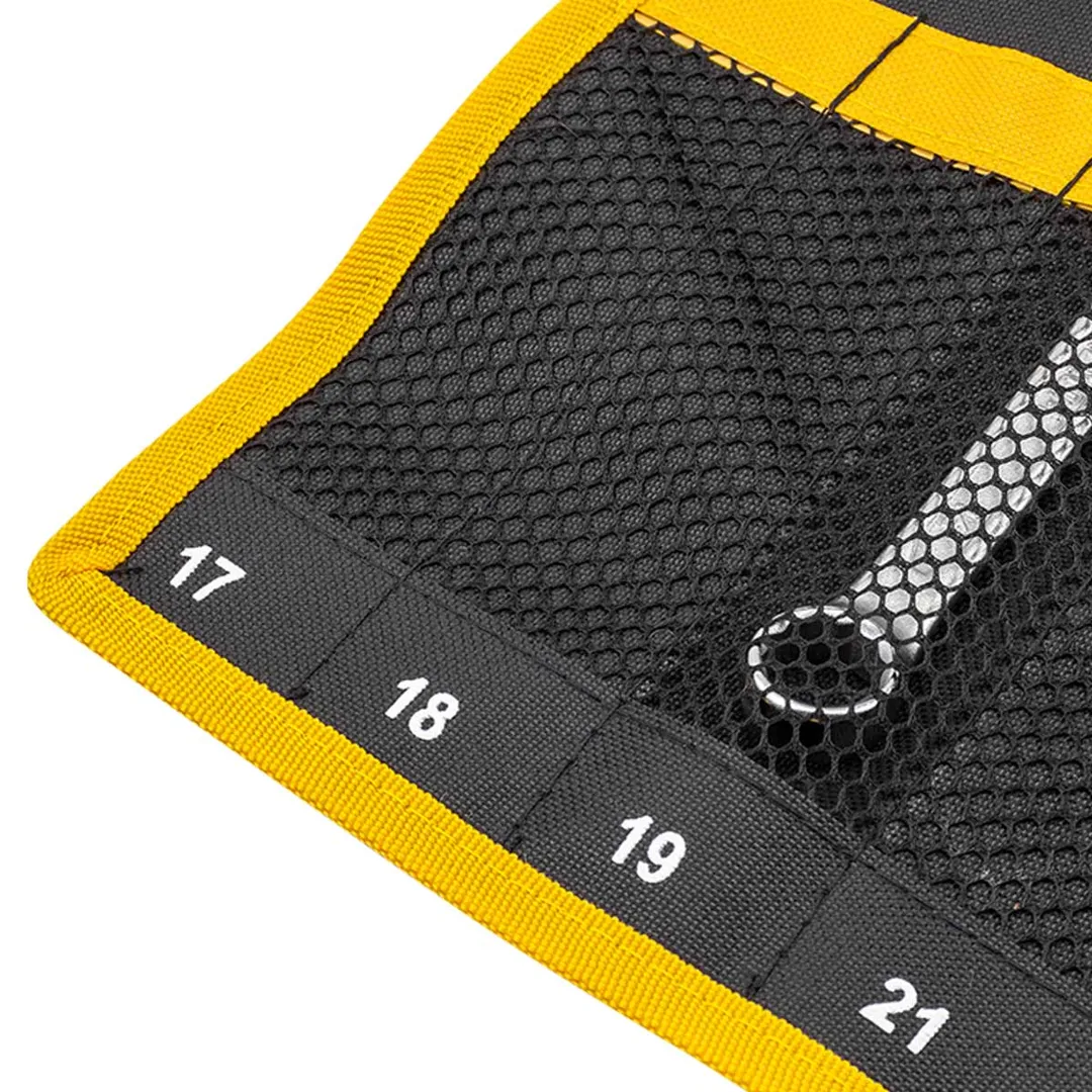 Органайзер для гаечных ключей – это хорошо продуманный аксессуар для хранения инструментов, который изготавливается для комфортного и долговечного пользования. Полотно (держатель) на 18 ключей гаечных. Чехол в развернутом виде имеет размеры 610 мм на 555 мм. Полотно-чехол для комбинированных, рожковых или накидных ключей имеет специальные отверстия с металлической оправой - они позволяют сэкономить место в гараже или мастерской, повесив набор гаечных ключей на стену или специальный стенд. Чехол-полотно для набора ключей гаечных имеет специальную фиксирующую ленту на застежке: набор комбинированных ключей можно скрутить и зафиксировать лентой.Преимущества работы с нами