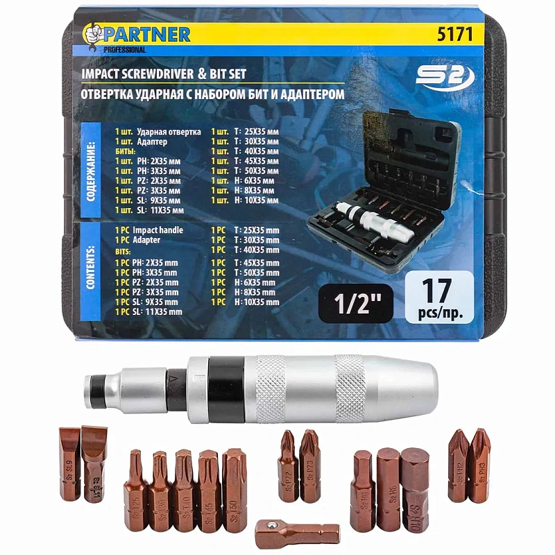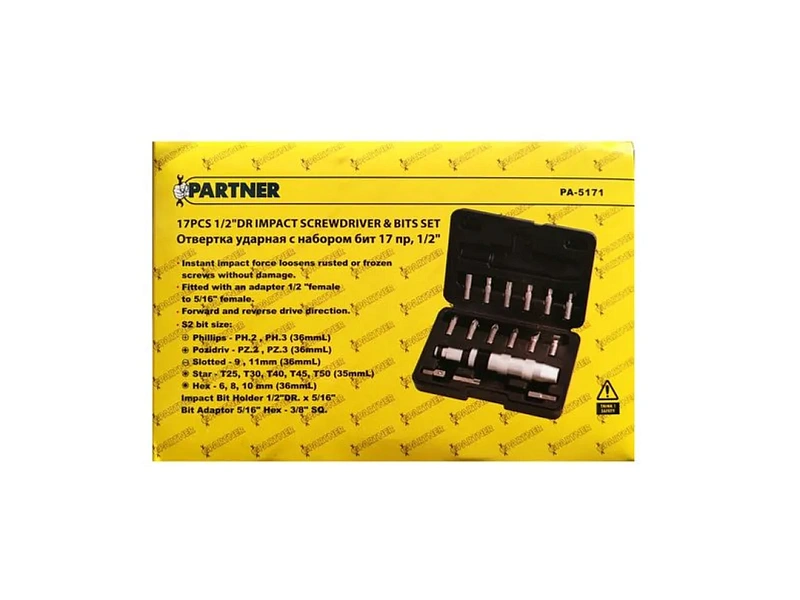 Отвертка ударная с набором бит и адаптерами 17 пр. 1/2'', Partner PA-5171