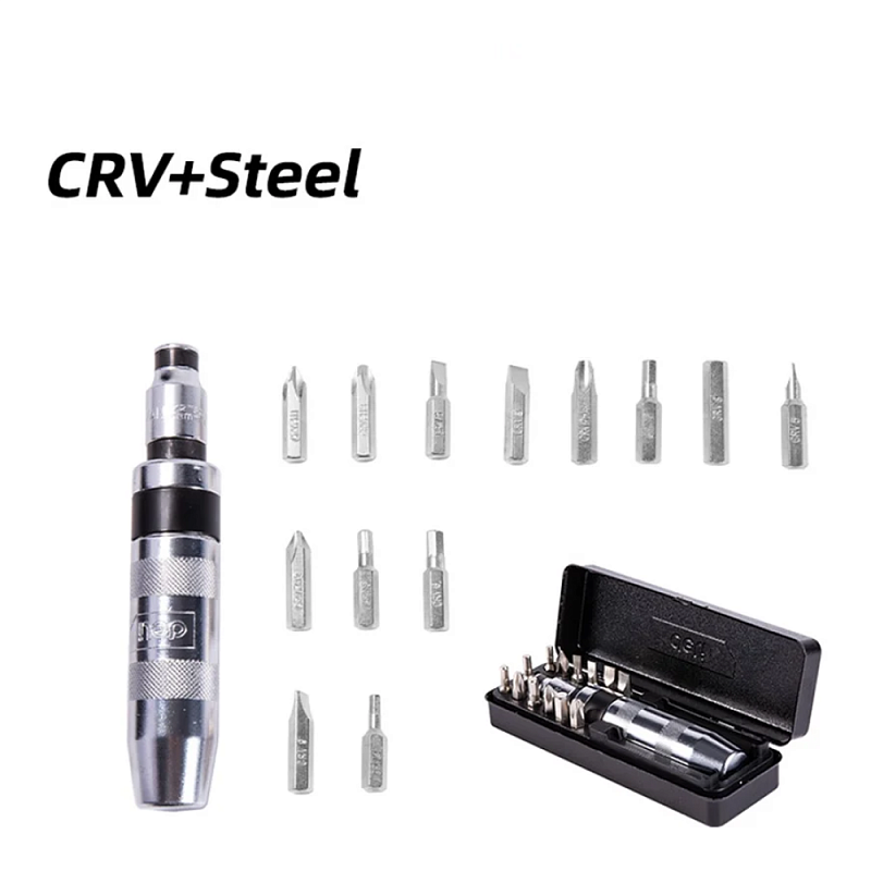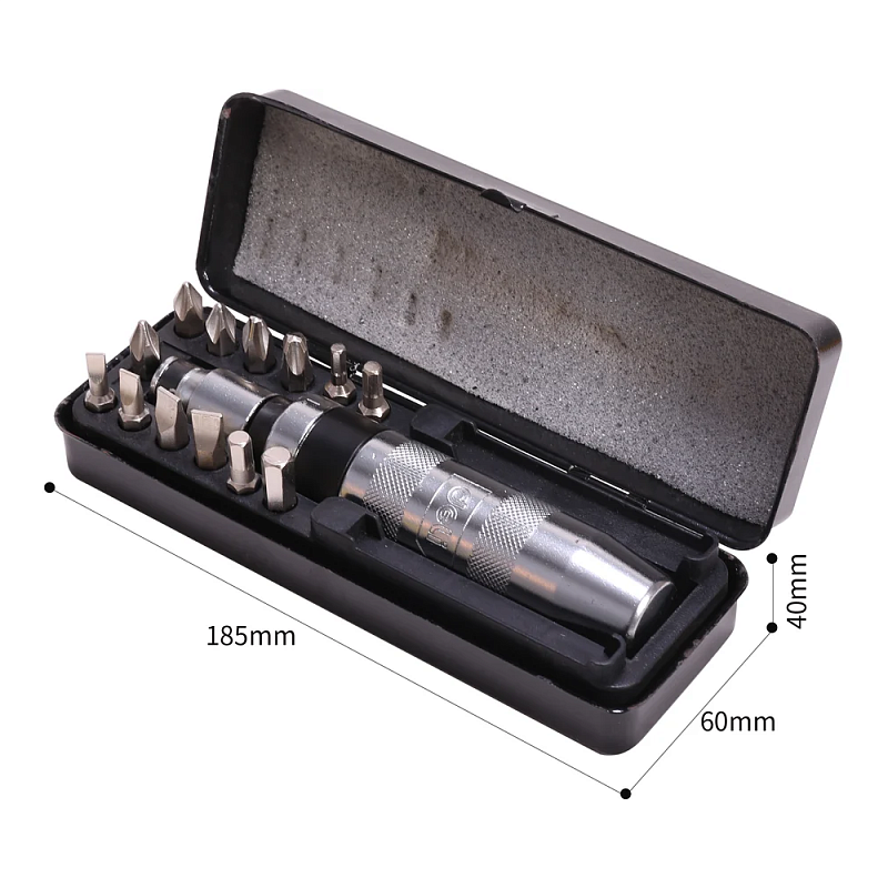 В комплекте с отверткой идут 13 бит различных размеров и типов: PH1, PH2x2, PH3, PH4, SL5, SL6, SL8, SL9, H4, H5, H6, H8.