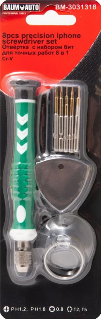 Отвертка ювелирная с комплектом бит для точных работ 8 пр. BaumAuto BM-3031318, описание и характеристики: