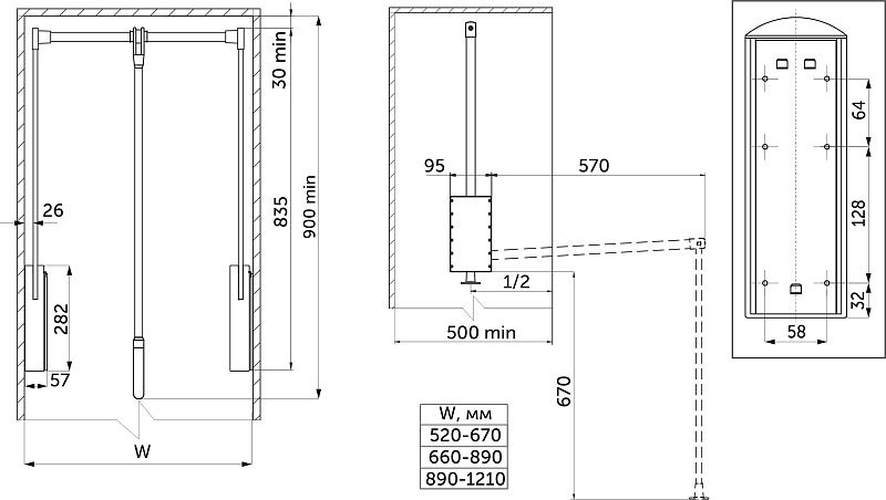 Пантограф VENTO помогает эффективно организовать хранение одежды в верхнем пространстве шкафа или гардеробной комнаты, максимально и с комфортом использовать труднодоступные зоны. Стильный дизайн, компактная и лаконичная конструкция. Цвет: черный Возможность регулировки по ширине 520-670 мм позволяет устанавливать пантограф в корпус с нестандартной шириной. Высококачественные материалы - алюминий, сталь, пластик. Газовый механизм с доводчиком на спуск и доводчиком на подъем (20 000 циклов при нагрузке 12 кг) обеспечивает мягкое и комфортное выдвижение и закрывание. Рекомендованная нагрузка на пантограф 12 кг. В комплекте: подъемник - 2 компл, штанга, труба ручки, ручка, соединители - 2 шт, ключ шестигранный, крепеж, инструкция AKSТехнические характеристики: