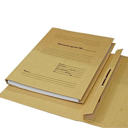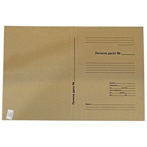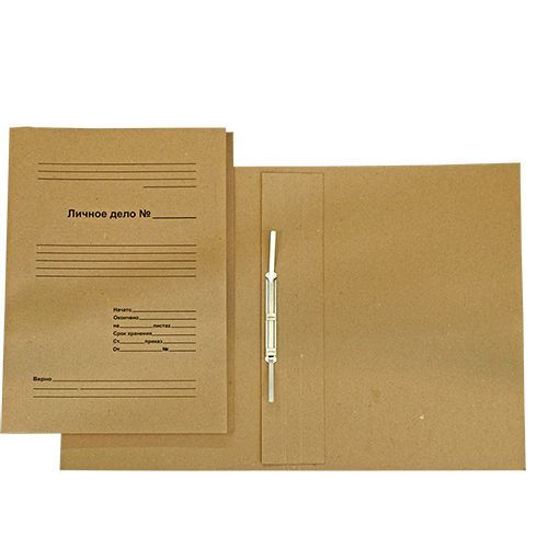 Папка «Личное дело» формата А4 изготовлена из немелованного картона повышенной плотности (620 г/ кв.м). Титульный лист папки содержит линованный идентификатор. Внутри папки металлический скоросшиватель.