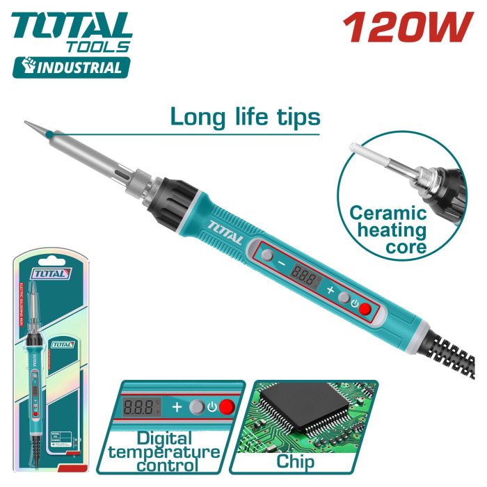 - Мощный электрический паяльник на 120 Вт, предназначенный для интенсивных паяльных работ, включая монтаж и ремонт электроники, пайку проводов и массивных соединений.