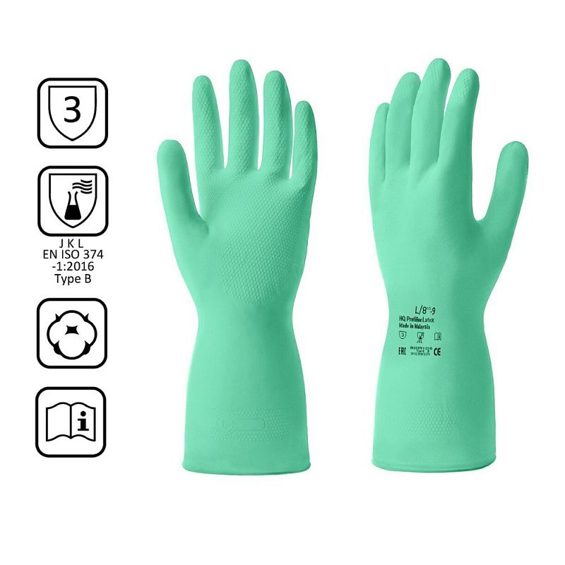 Перчатки латексные для защиты от химических воздействий (класс защиты В) и общих производственных загрязнений.