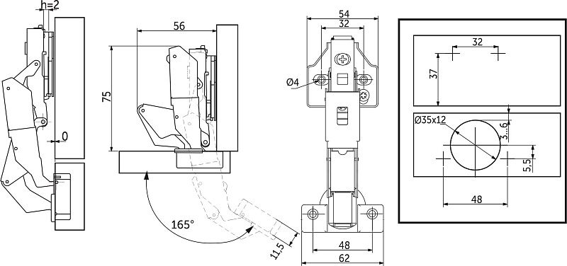 Петля 165° накладная с доводчиком 48мм h2 clip-on 3D, саморезы, заглушки, 0-е вхождение, упак. = 2 шт., PRIME by AKS 112684, описание:
