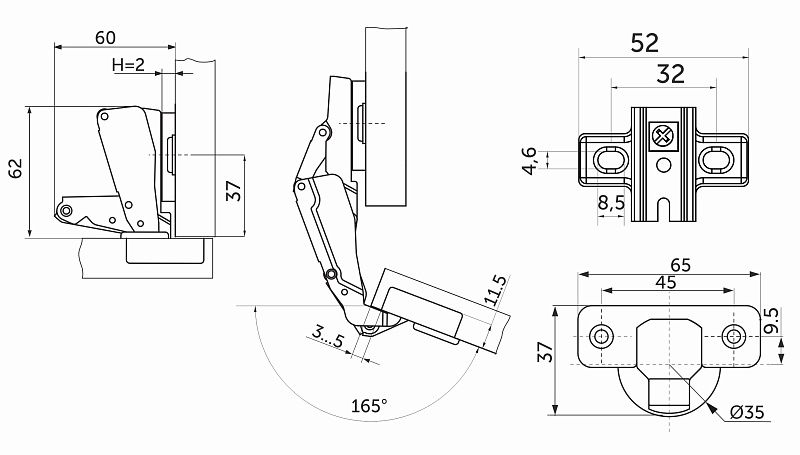Петля 165° накладная с пружиной 45мм h2 slide-on AKS 123232